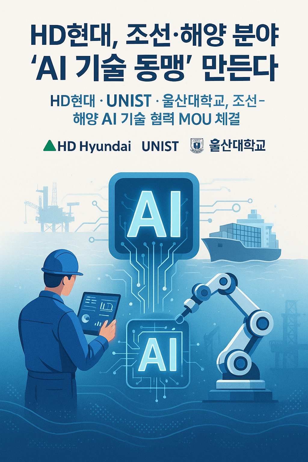 HD현대가 조선·해양 분야의 AI 기술 개발을 위해 UNIST(울산과학기술원), 울산대학교와 MOU를 체결하며 산업계의 주목을 받고 있다. 이번 협약은 ‘AI 기술 동맹’ 형식의 산학협력 모델로, 조선업 특화 AI 파운데이션 모델, 자율 공정 플랫폼, 데이터 생태계 구축, AI 전문 인재 양성 등의 공동 추진을 핵심 목표로 한다.